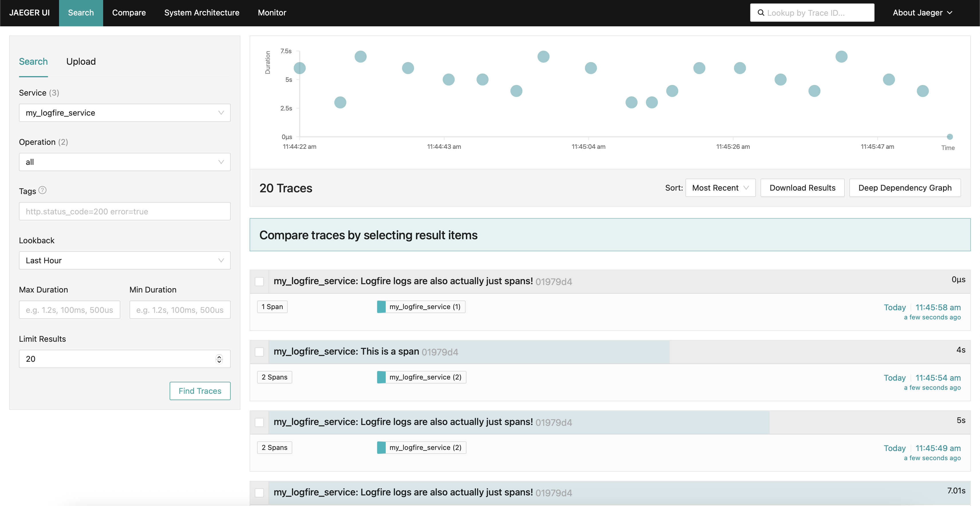 Finally open http://localhost:16686/search?service=my_logfire_service to see the traces in the Jaeger UI.