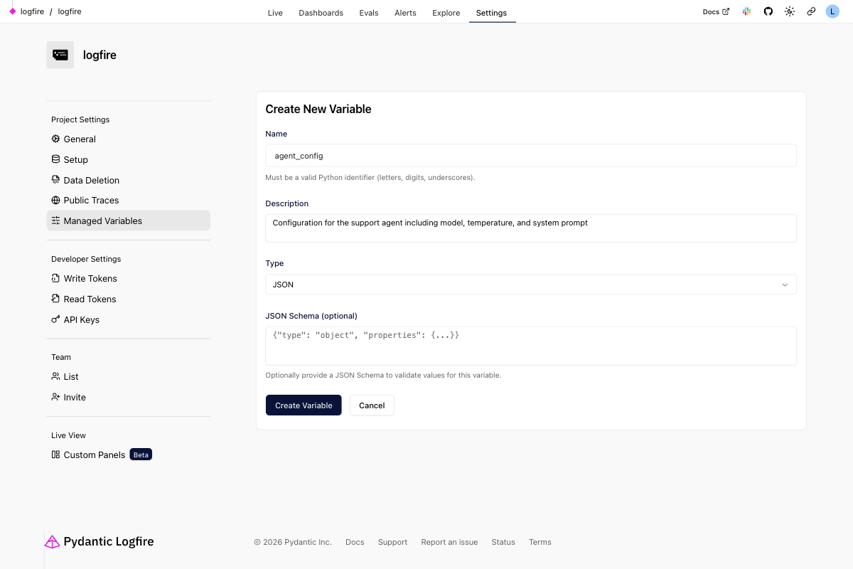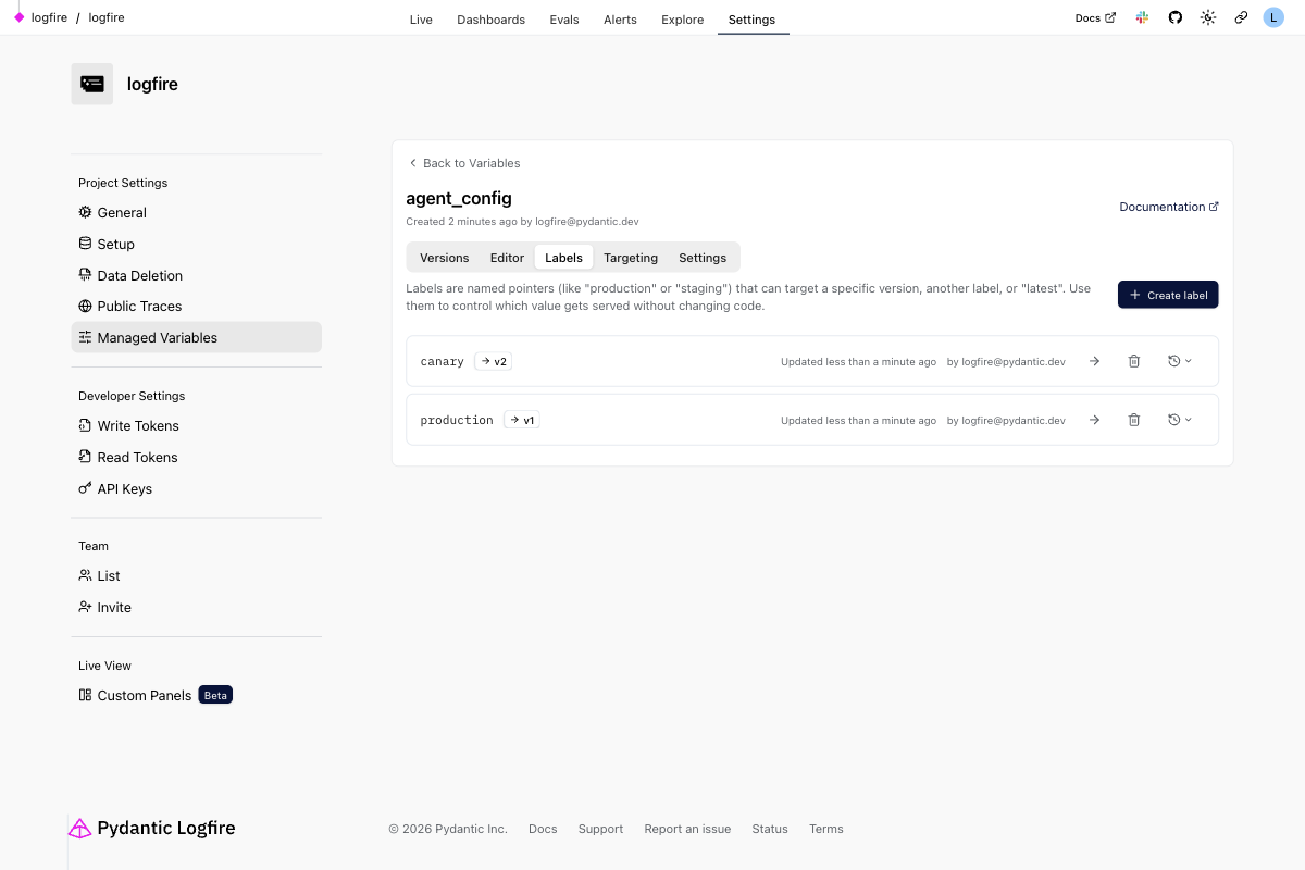Changes take effect quickly, and every variable resolution is visible in your traces. This trace-level visibility means you can correlate application behavior directly with specific configuration versions, enabling A/B testing, automated prompt optimization, and online evaluations using the same observability data you're already sending to Logfire.